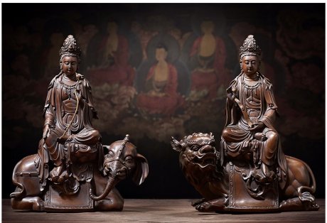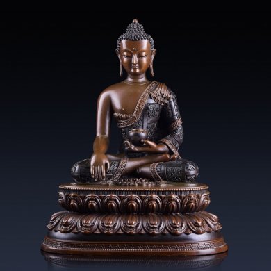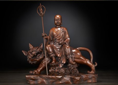 地藏王菩薩一手捧珠,一手拿錫杖,性格刻畫栩栩如生,色澤富貴古雅。火焰紋背光是帶有濃厚藝術(shù)色彩的裝飾紋樣,蘊(yùn)含了吉祥昌盛的美好寓意,是我國(guó)佛像藝術(shù)形式中不可缺少的組……