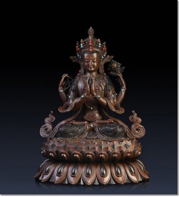 四臂觀音菩薩頭戴五佛冠,發(fā)黑色結(jié)髻,中央二手合掌放于胸前,捧有摩尼寶珠,右手持水晶念珠。左手拈八瓣蓮花與耳際齊,面貌寂靜含笑。下面清晨六點(diǎn)古玩小編為你帶來純銅四臂觀音佛……