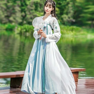 這款為齊胸襦裙,配大袖衫。在古代,一般女子的襦裙裝裙子束的都不是很高,而南北朝到隋唐五代時期出現(xiàn)的一種裙腰束的非常高的襦裙,一些服裝史上多稱之為高腰襦裙,根據(jù)現(xiàn)在……