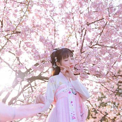 俏麗若三春之桃,三清素若九秋之菊。上襦繡纏枝山櫻,從衣袖灼灼蔓延至整件衣服。櫻花為粉色的花瓣點上點點白色過渡,秀的為山櫻,朵朵小巧精致委婉可人。料子為真絲棉,通透……