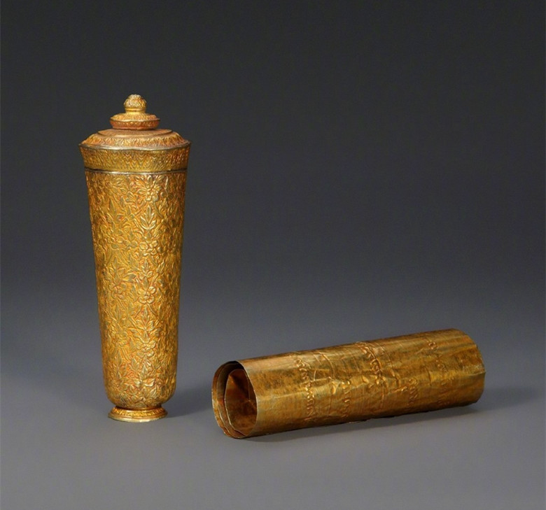 這是金筒和金箔鏨印的表文,上面的文字是現(xiàn)在的泰文,右邊的金箔可以卷起來放進左邊的金筒中,金筒上滿是花紋非常漂亮,明朝開始,就有很多東南亞國家朝貢用這種金葉表文,現(xiàn)……