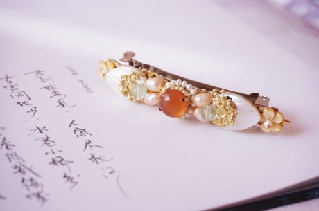 貝產(chǎn)珍珠,珍珠飾貝,如此,便有了這精美雅致的杰作,請欣賞清晨六點(diǎn)古玩小編為你帶來的白蝶貝殼雕花珍珠發(fā)夾。……